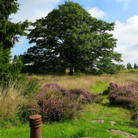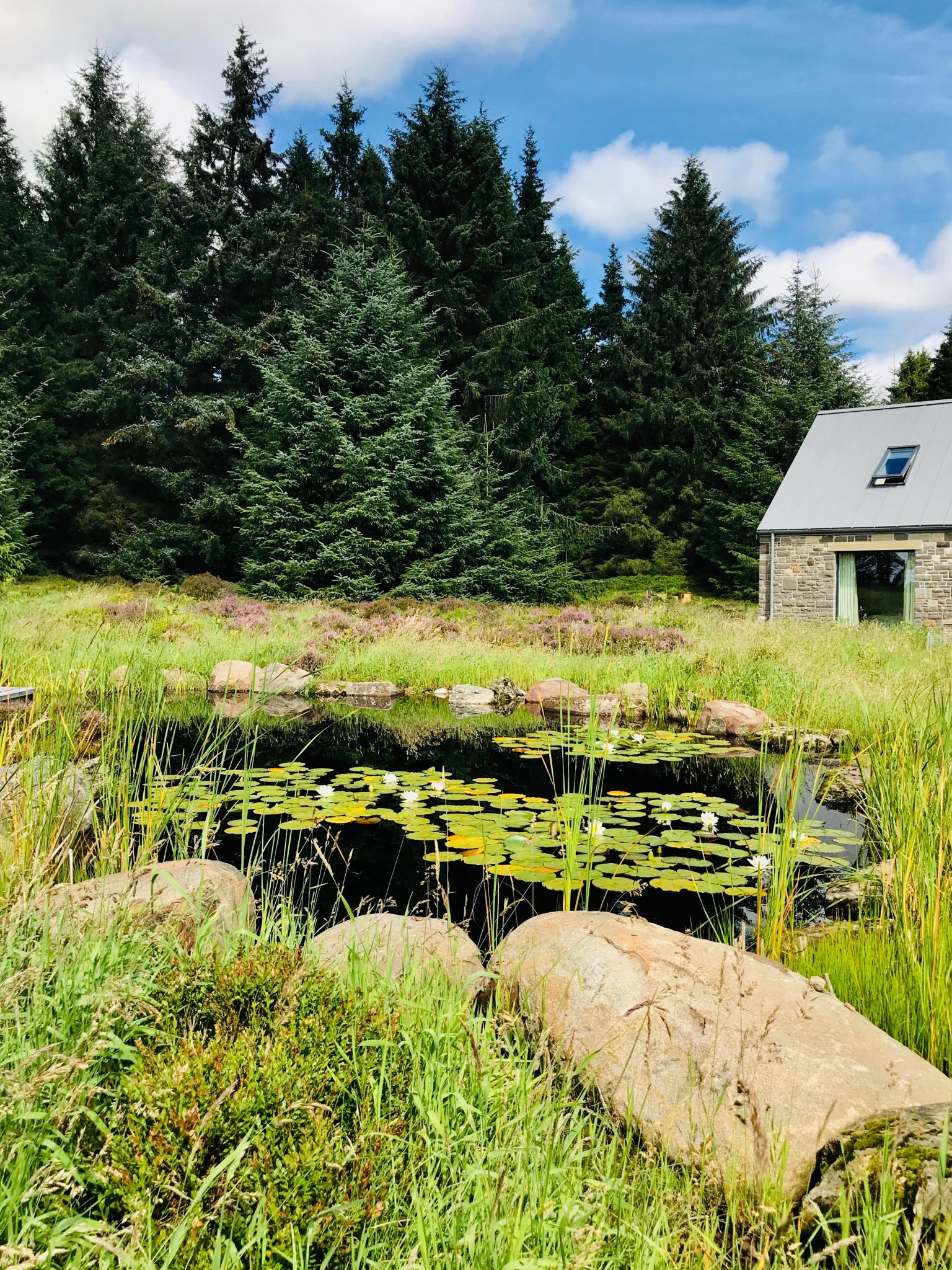 First on the wishlist was a wildlife pond, completely natural, spacious enough to catch reflections of the big, open sky and with a Scottish larch deck sitting over it to allow the visitor to get up close to the water. Mown paths were created through the moor to take you there and flag irises and water lilies adorn the feature. Boulders sourced on the estate edge the pond and old, preserved tree stumps add interest and habitat. The pond was built by Water Gems’ Stuart Booth and his team. This beautiful feature is surveyed by a single, elegant heron (made out of an old motorbike by sculptor Helen Dennerly who also created the two giraffes outside the Omni Centre at the top of Leith Walk).