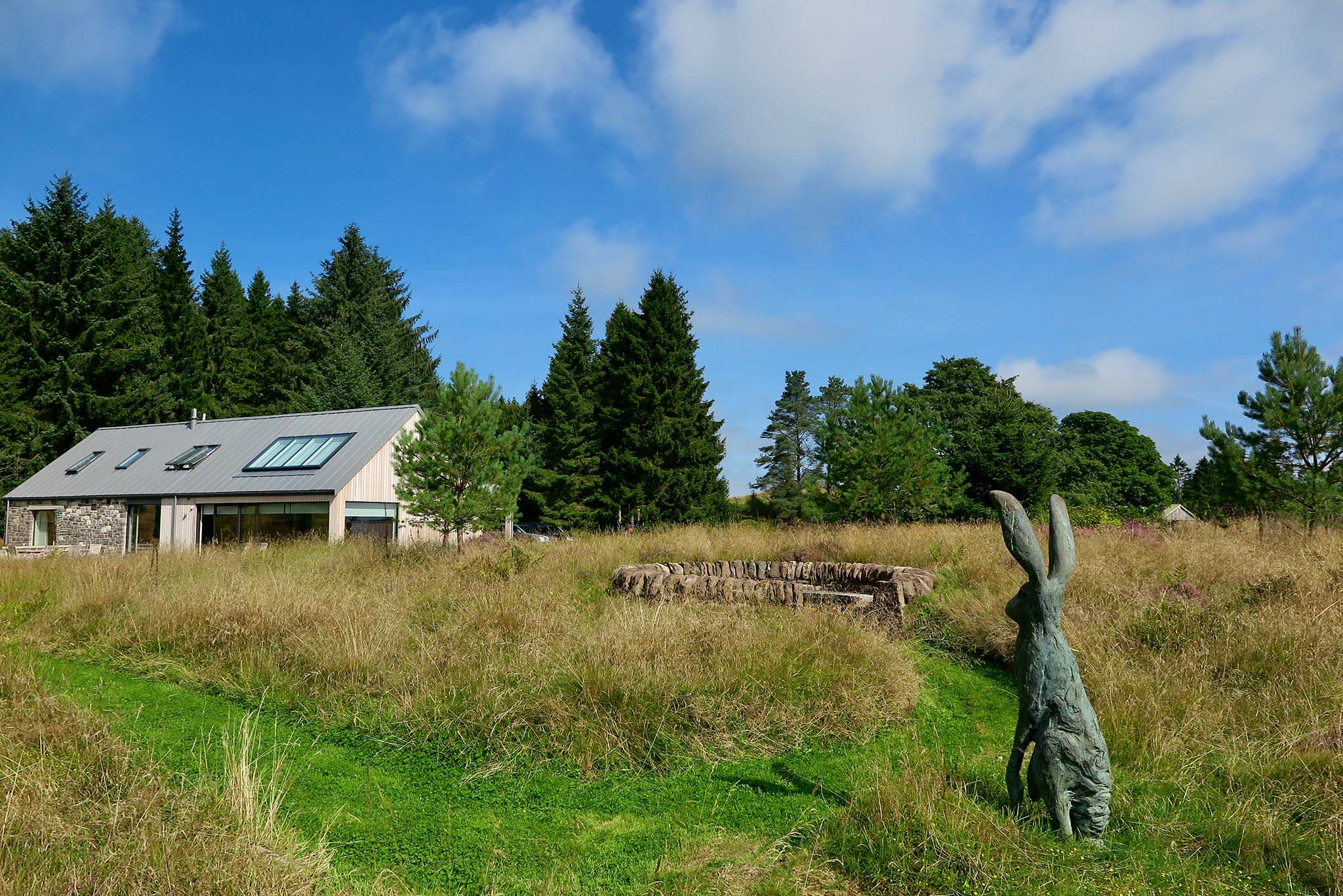 The clients had an idea of having a place to sit on summer evenings, hunkered down out of the wind where the ground rises away from the house and with views to the hills to the south and west. Using stone from the estate I designed a circular drystone wall with bench (not dissimilar to a sheep pen). A slatted Scottish larch bench and some chunky logs in the middle provide somewhere to lay drinks. A fire pit could also be used here. The structure is reached by more mown paths and this almost hidden gem is signposted by a Stanley Dove sculpture of a giant hare.