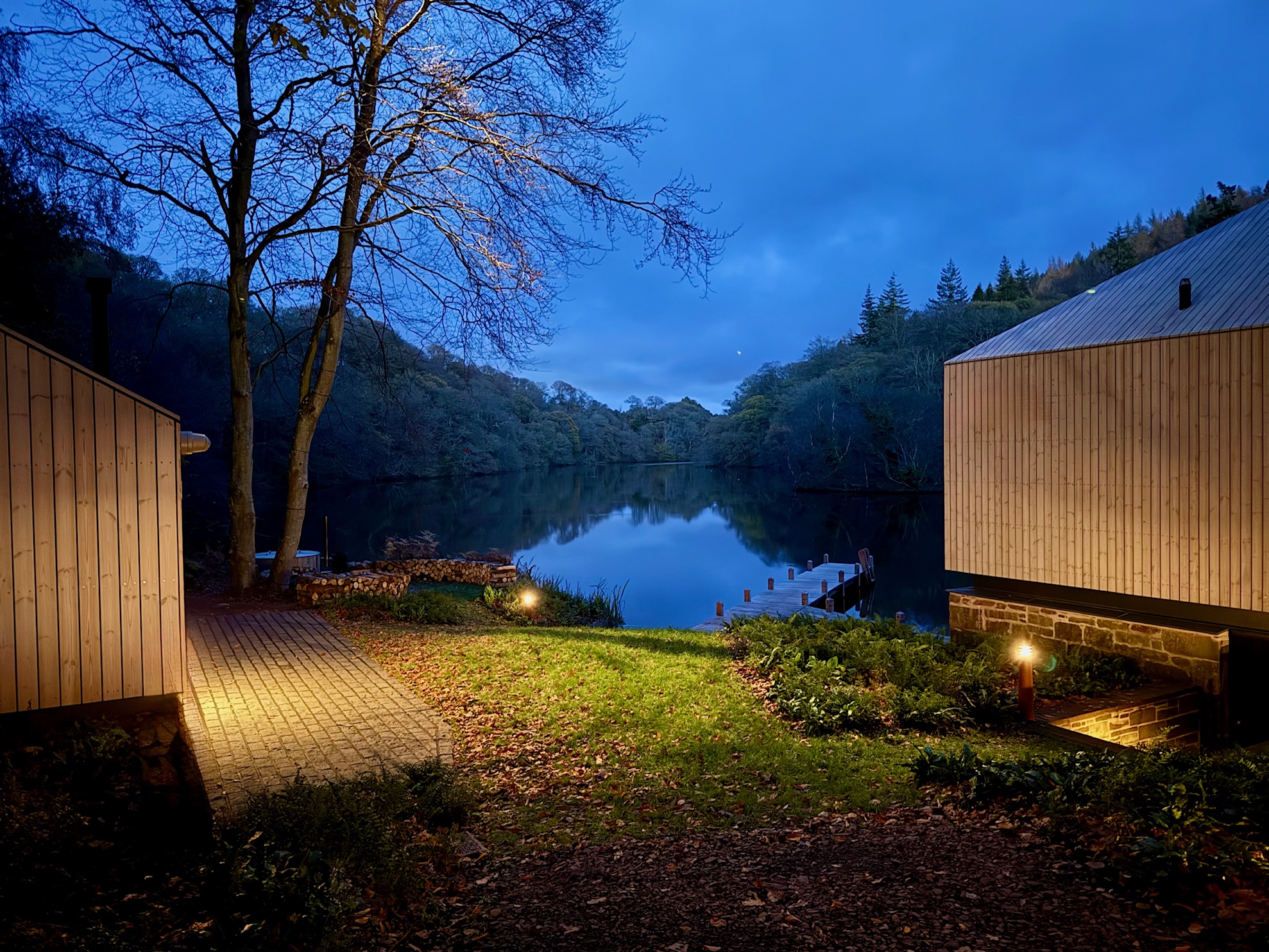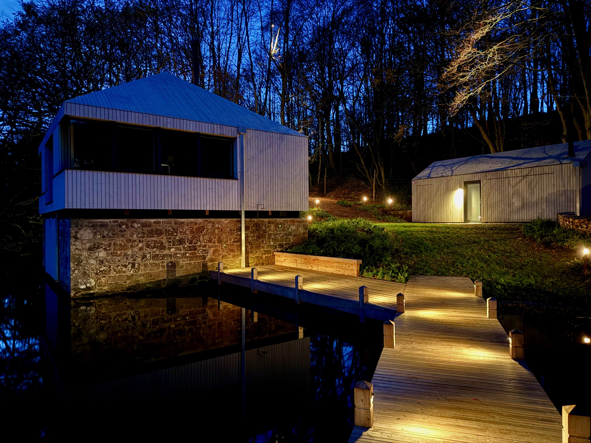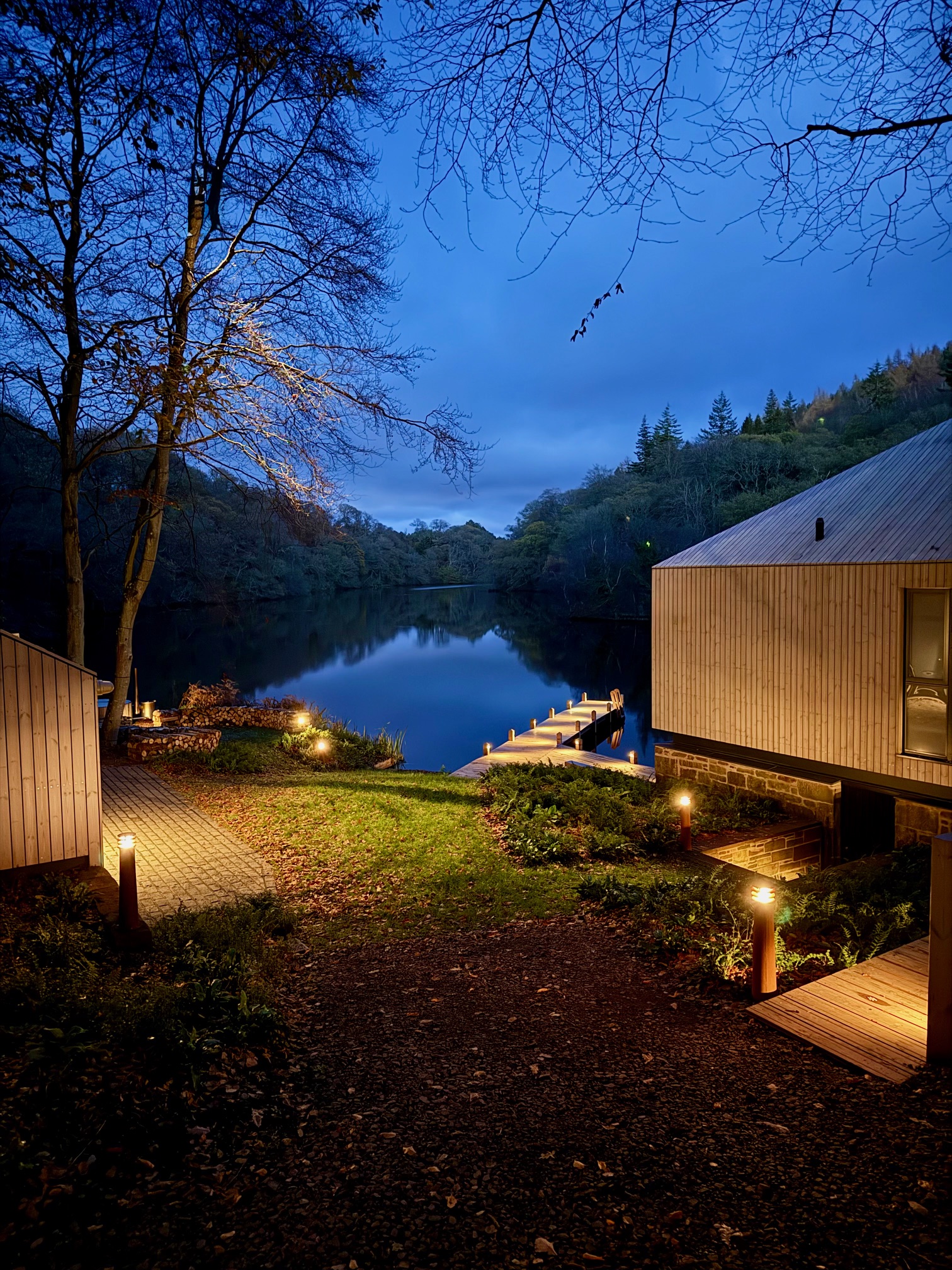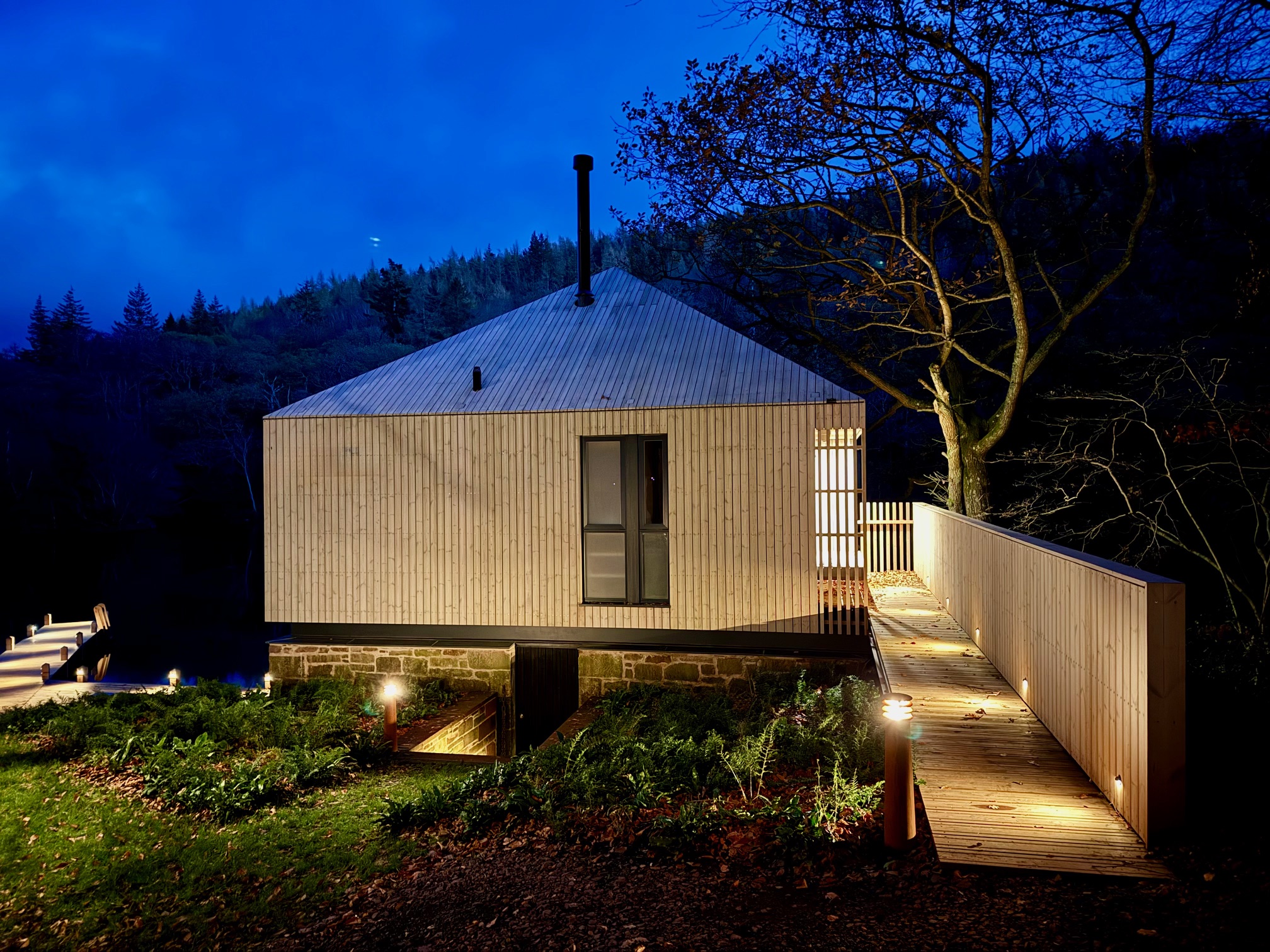 Any rural setting can, by its very nature, be extremely dark at night.  So lighting to allow visitors to reach the boat house safely on foot was necessary.  Careful consideration was given as much as possible to avoiding light pollution and minimising disruption to wildlife.  Warm white light, focal point specific light fittings and an easily controlled system were all installed.  (The photos here suggest the lights are brighter than they are in reality.)  The end result, thanks to installation by MGD Electrical, is both magical and practical.
