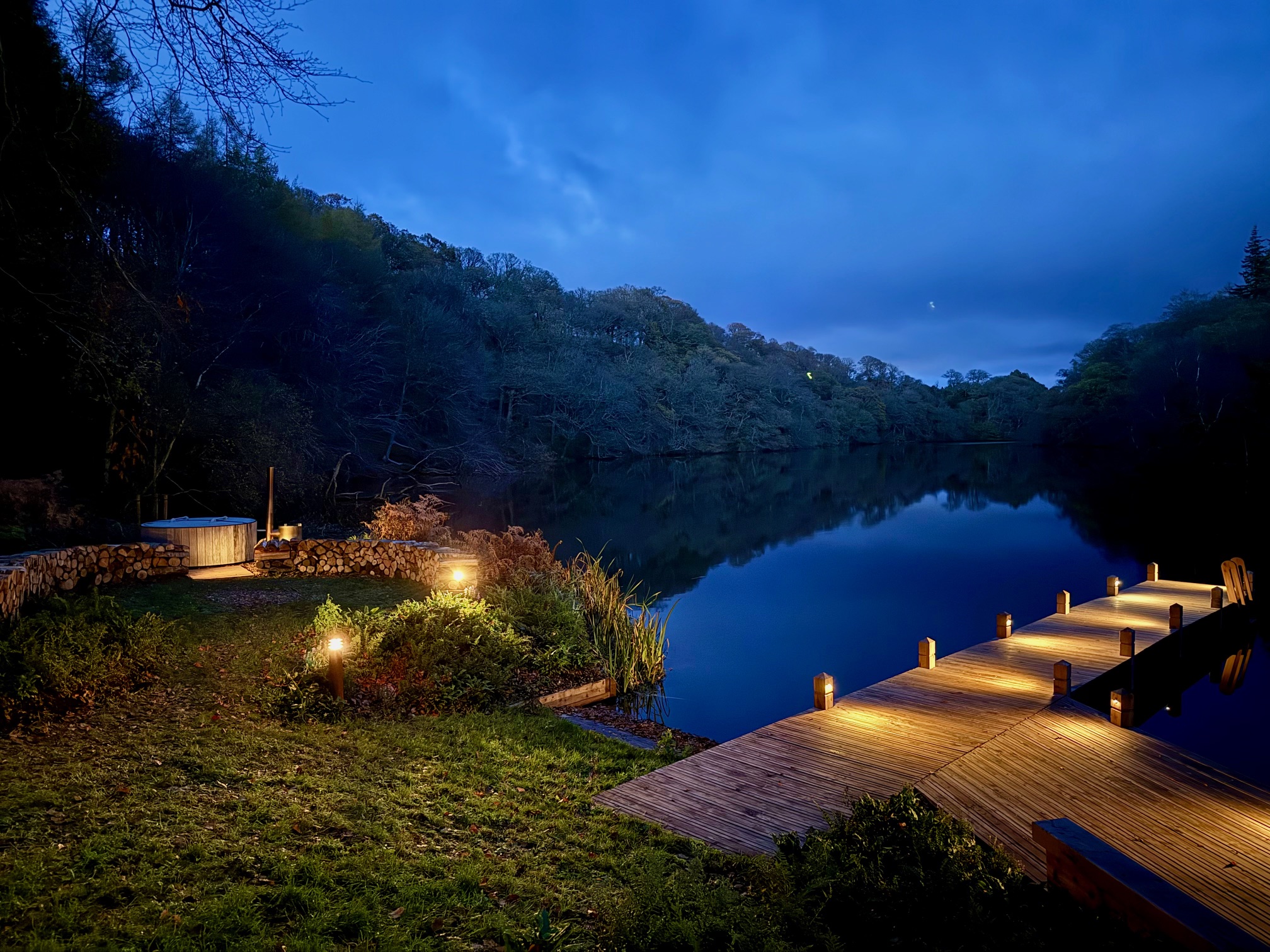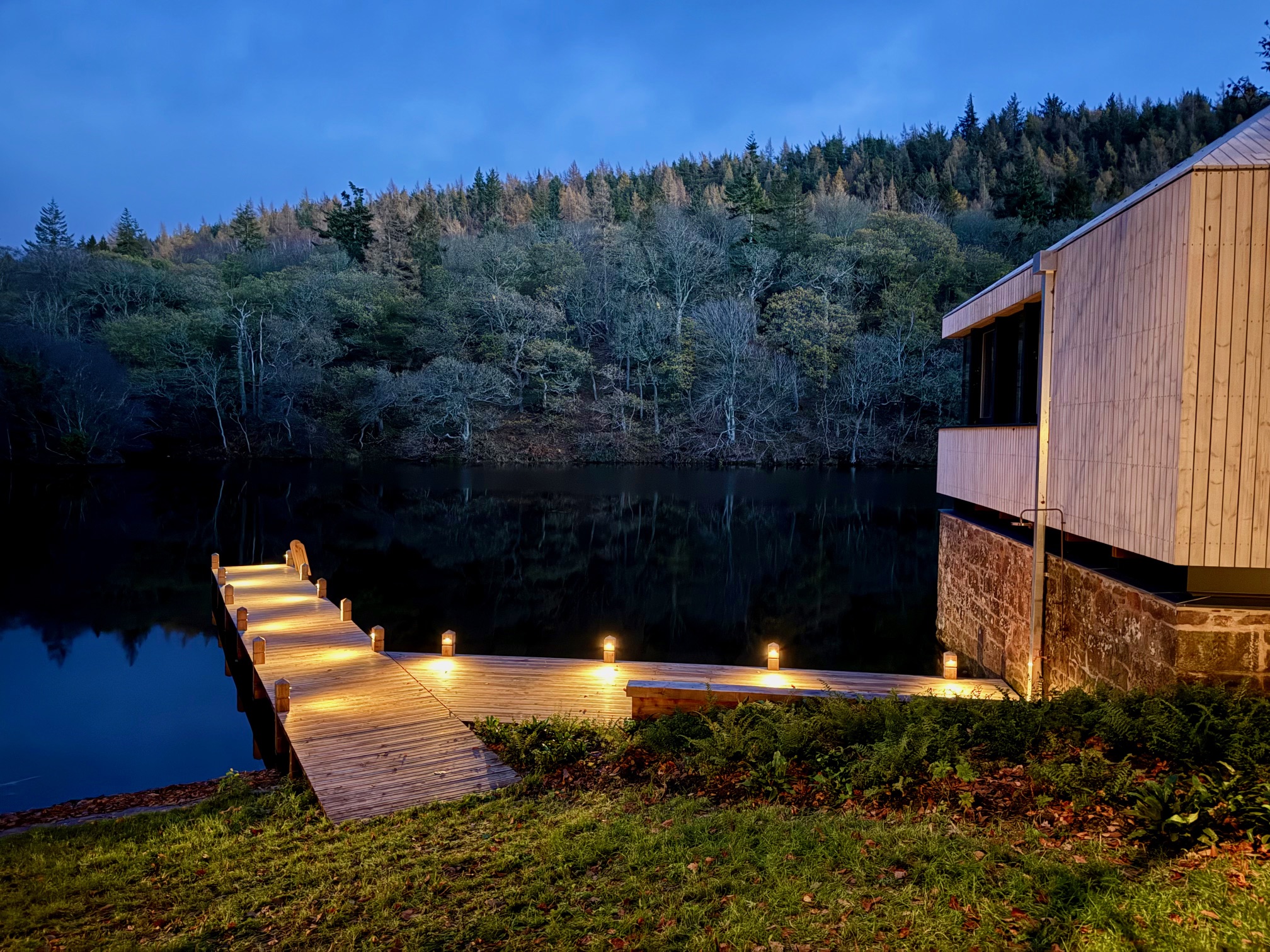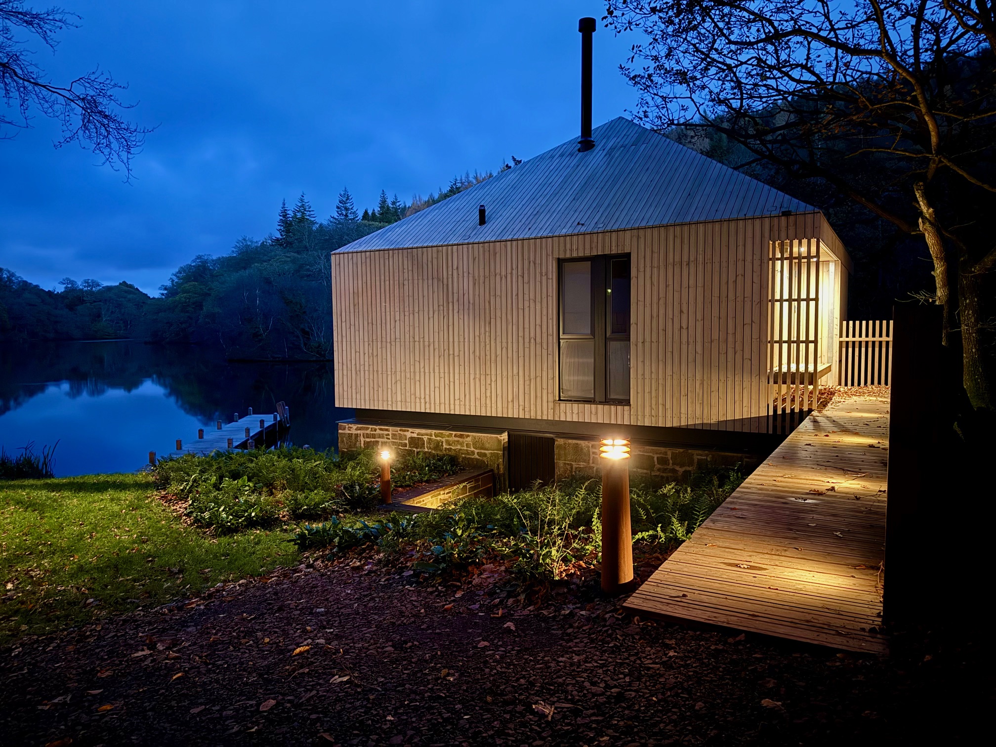 Any rural setting can, by its very nature, be extremely dark at night.  So lighting to allow visitors to reach the boat house safely on foot was necessary.  Careful consideration was given as much as possible to avoiding light pollution and minimising disruption to wildlife.  Warm white light, focal point specific light fittings and an easily controlled system were all installed.  (The photos here suggest the lights are brighter than they are in reality.)  The end result, thanks to installation by MGD Electrical, is both magical and practical.