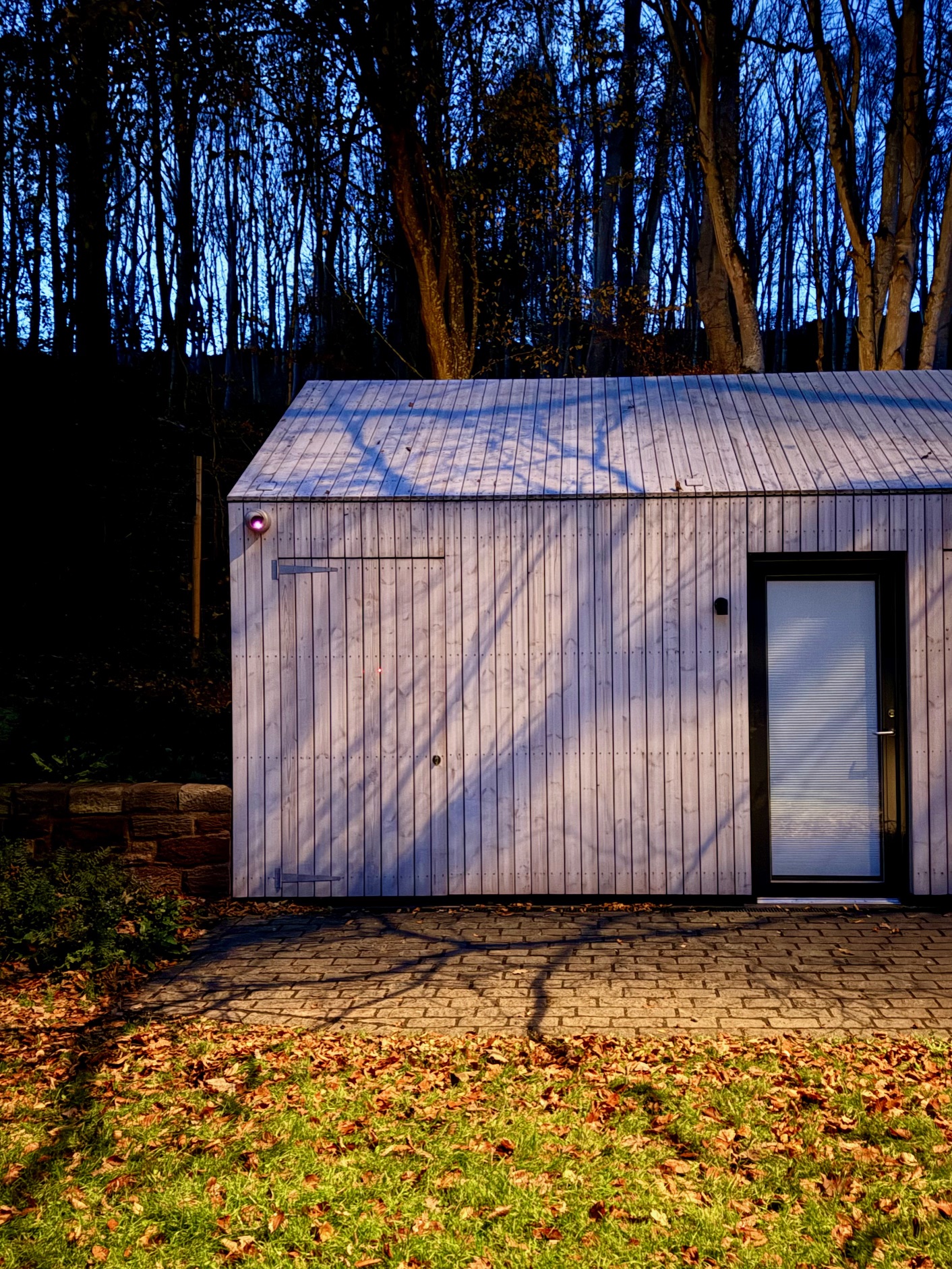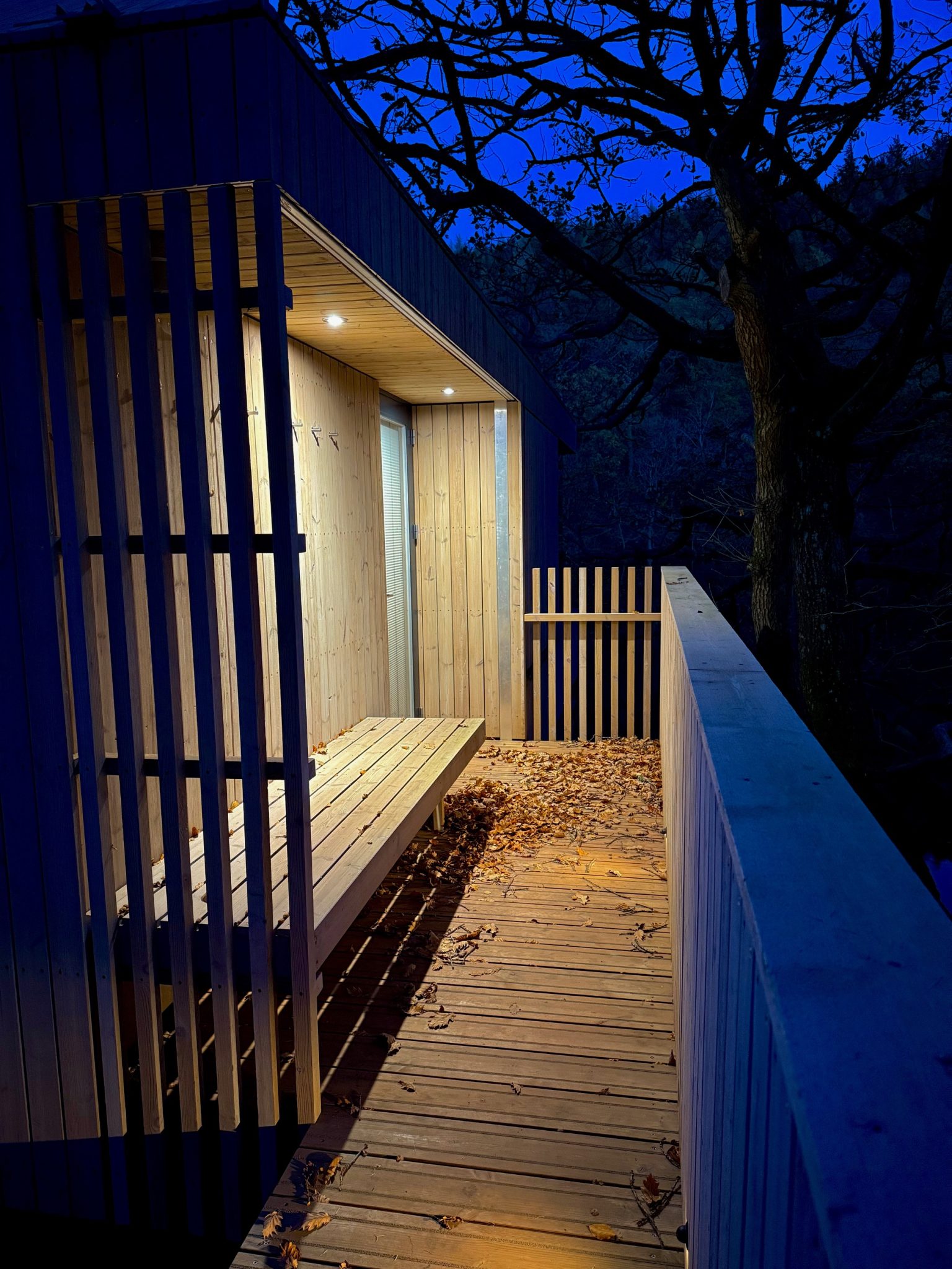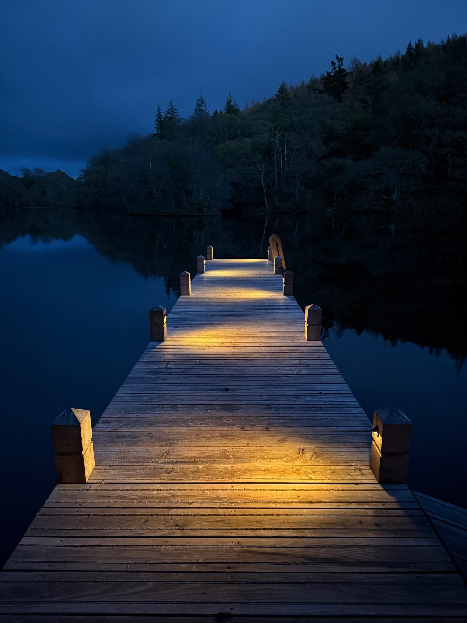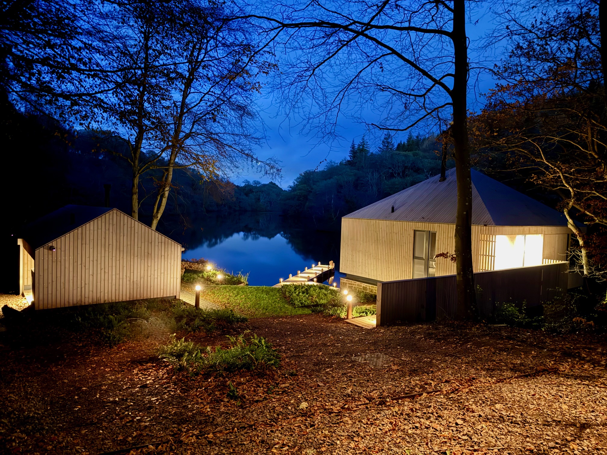 Any rural setting can, by its very nature, be extremely dark at night.  So lighting to allow visitors to reach the boat house safely on foot was necessary.  Careful consideration was given as much as possible to avoiding light pollution and minimising disruption to wildlife.  Warm white light, focal point specific light fittings and an easily controlled system were all installed.  (The photos here suggest the lights are brighter than they are in reality.)  The end result, thanks to installation by MGD Electrical, is both magical and practical.