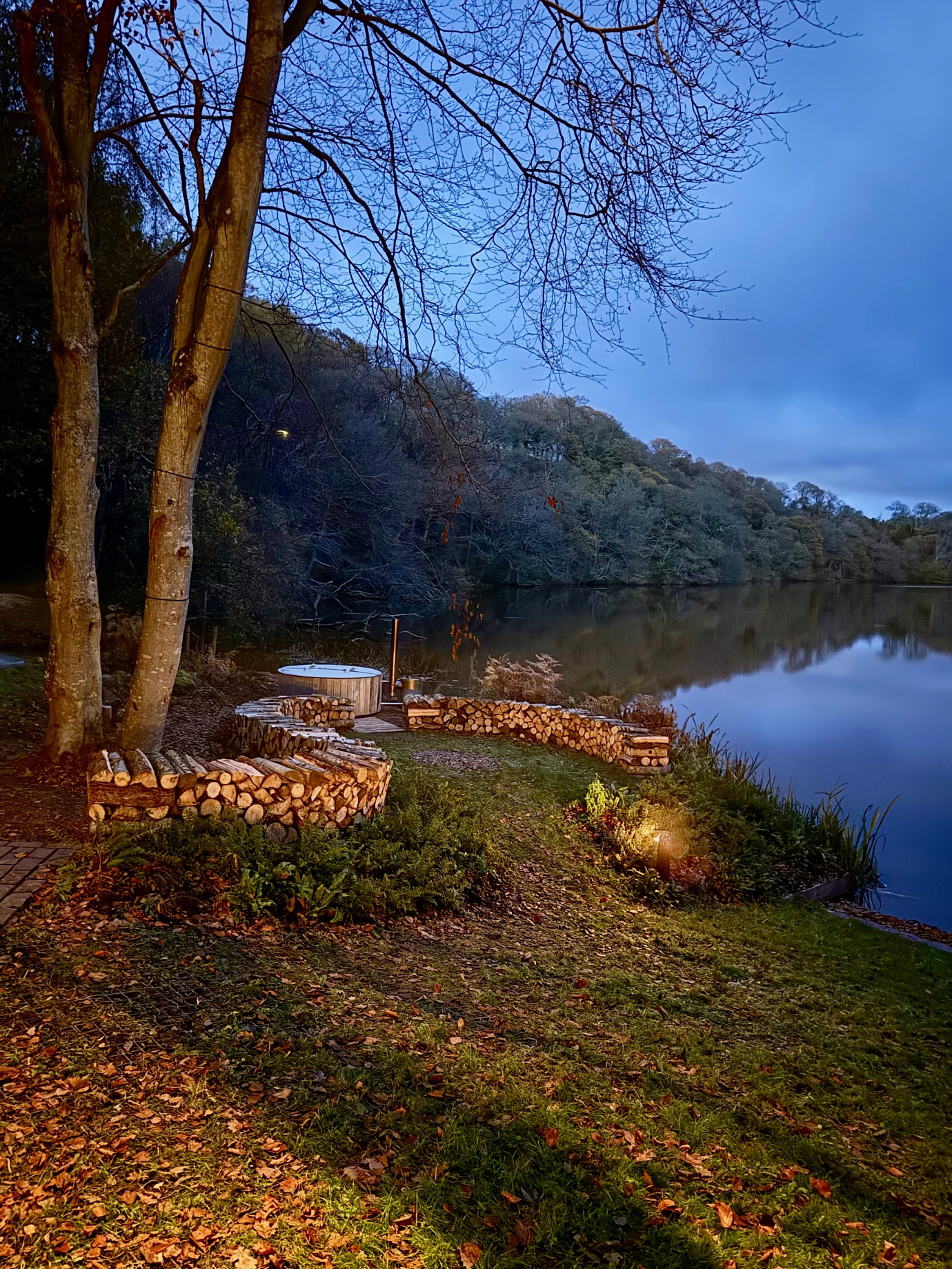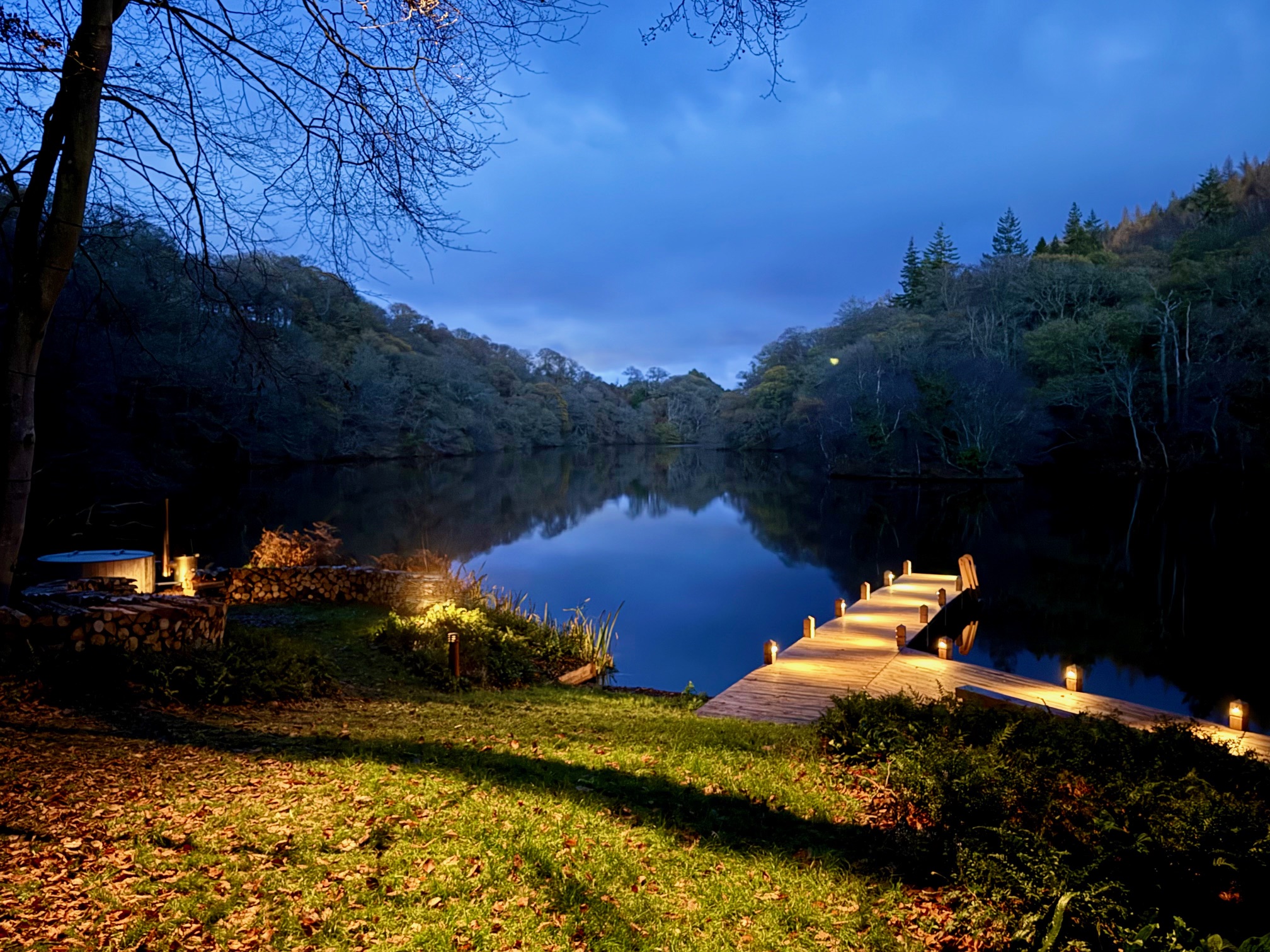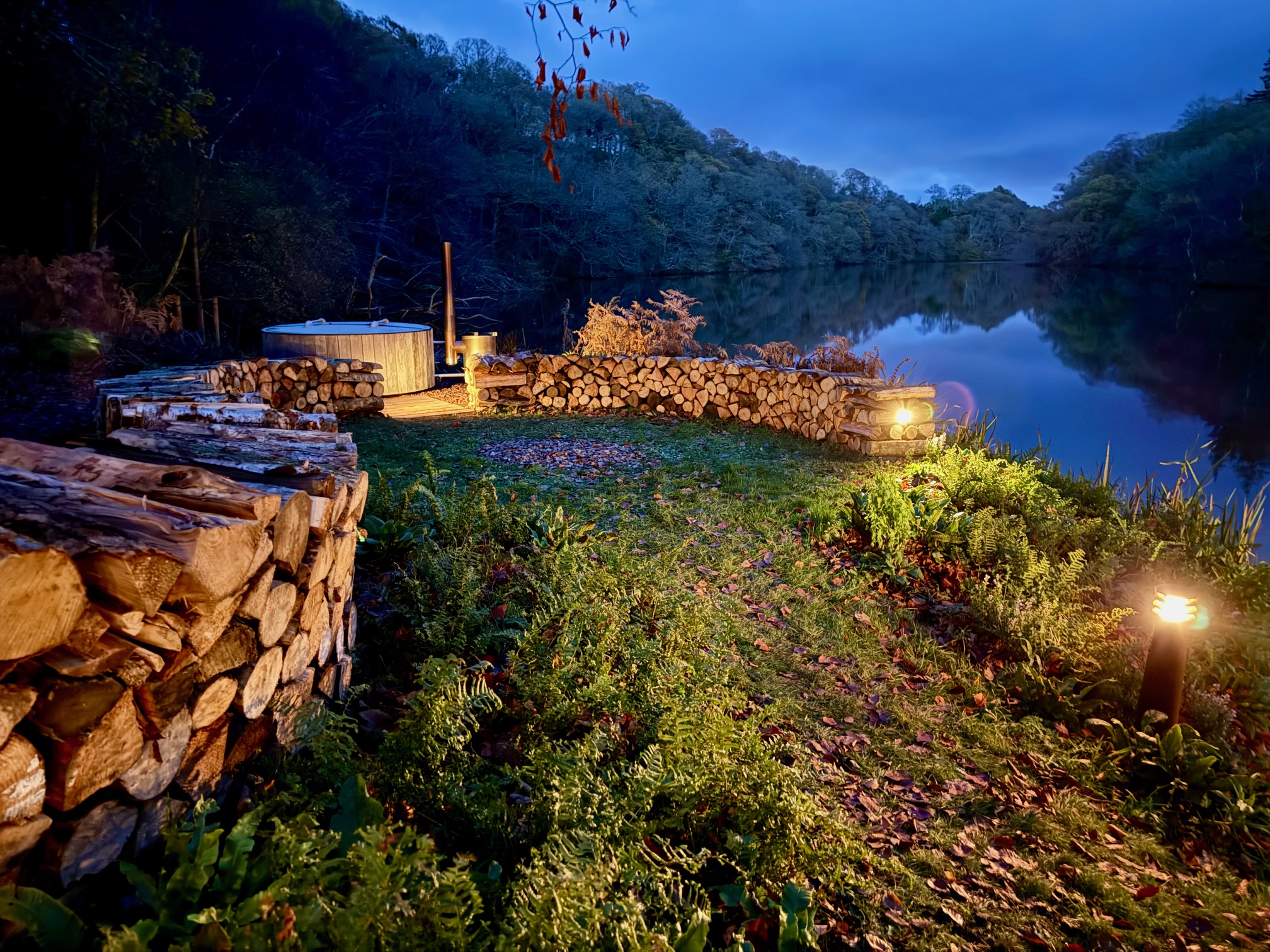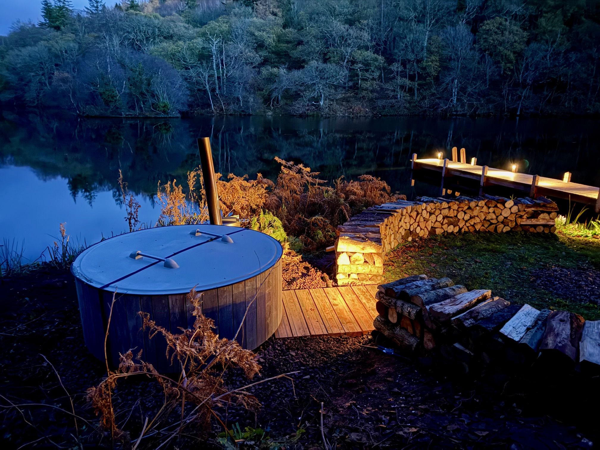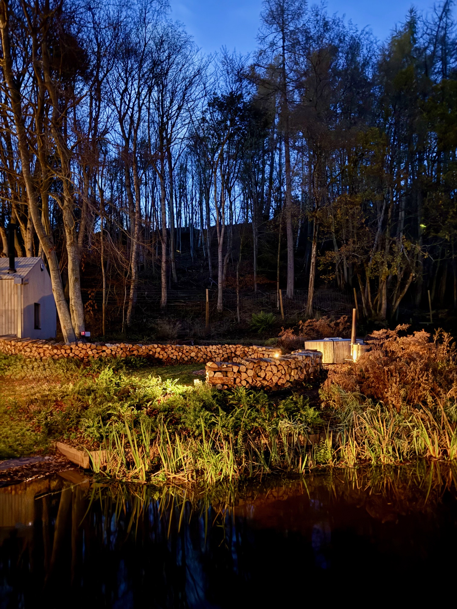 For the jetty, decked area and slipway I opted to angle the jetty so it drew the eye down the lake rather than across  (the lake is narrow but long).  A smokeless fire pit surrounded by a curving log wall seat is located close to the water’s edge with views onto the water.  A wood-burning hot tub is tucked in just behind the log wall, again enjoying a lakeside location as well as excellent views of both the woodland, lake, boat house and bothy.  All of these features were carefully installed by Water Gems.