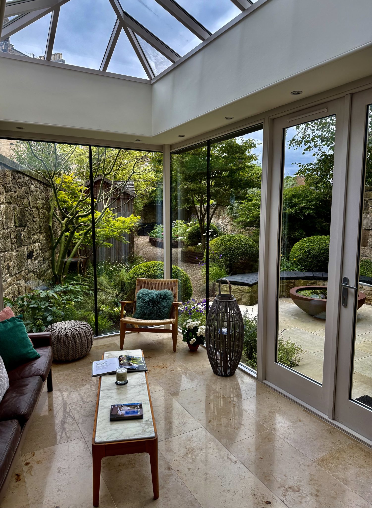 When she surveyed the garden, Carolyn was struck by the beauty of the high walls that surround it, so she had these repointed, recessing the sand-coloured mortar so that each stone block stands slightly proud. “In Scotland, because of the long hours of summer daylight, garden lighting isn’t always essential but here I’ve used subtle up-lighters to bring out the beauty of the walls.”